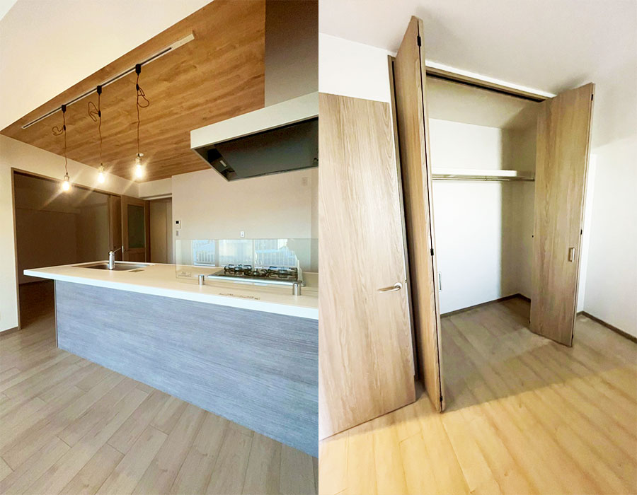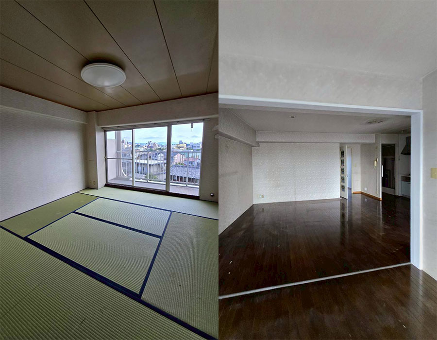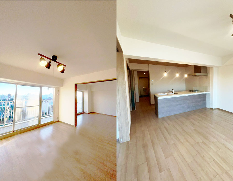 全面改装工事 マンションリフォーム 全面改装工事 大阪市 2026.02.20 【全面改装工事】 内装/お風呂/キッチン/トイレ/洗面台 リビングは和室だったお部屋と ダイニングを1つのリビングにすることで 広々としたLDKに大変身しました。 間取りも依然と大きく変わり、 収納スペースが増え使いやすくなりました。 リフォームデータ Before(施工前) After(施工後)